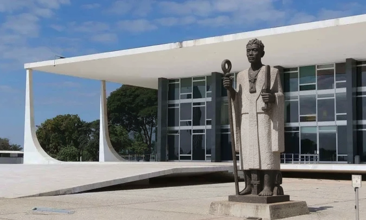 A estátua nesta imagem é uma representação de Xangô, o Orixá da Justiça nas religiões de matriz africana, como o Candomblé e a Umbanda. A imagem original foi editada para substituir a tradicional estátua “A Justiça”, de Alfredo Ceschiatti, por esta figura.