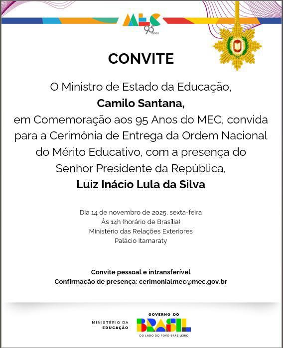No primeiro momento de alegria, compartilhamos o convite com toda a nossa rede. Contudo, após buscarmos mais informações junto ao Cerimonial do Ministério da Educação, descobrimos que, tradicionalmente, esta é uma cerimônia oficial com um número restrito de convidados/as. O espaço é limitado e haverá outros/as agraciados/as.